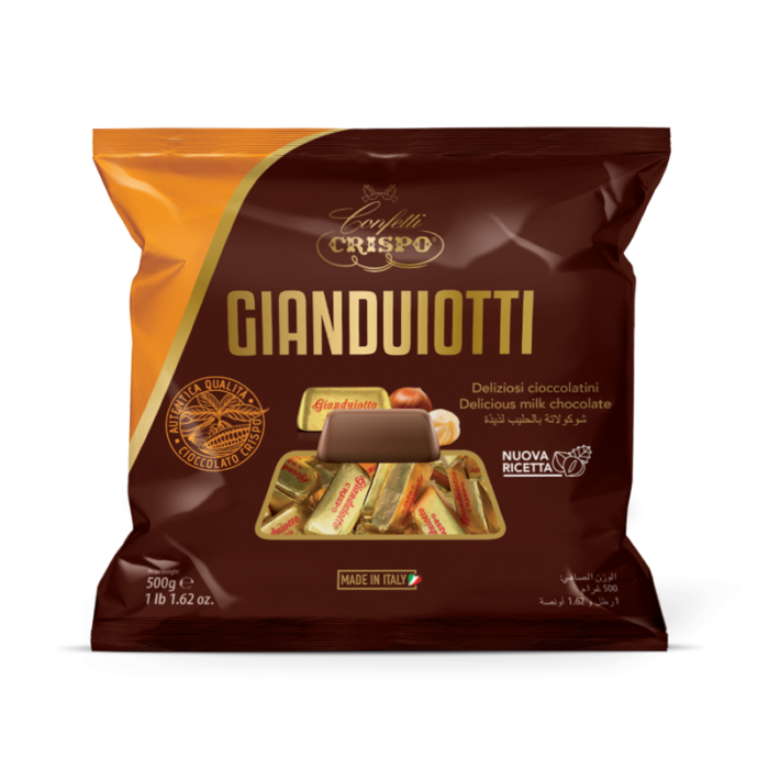 Experience the rich taste of traditional Italian confectionery with Crispo Gianduiotti Milk 500g. These smooth, melt-in-your-mouth chocolates feature a luxurious 70% hazelnut cream center, made with real hazelnuts and blended with cocoa for a perfectly nutty, velvety texture. Each piece is coated in creamy milk chocolate (30%), crafted with cocoa butter and whole milk powder for a balanced sweetness and silky finish.