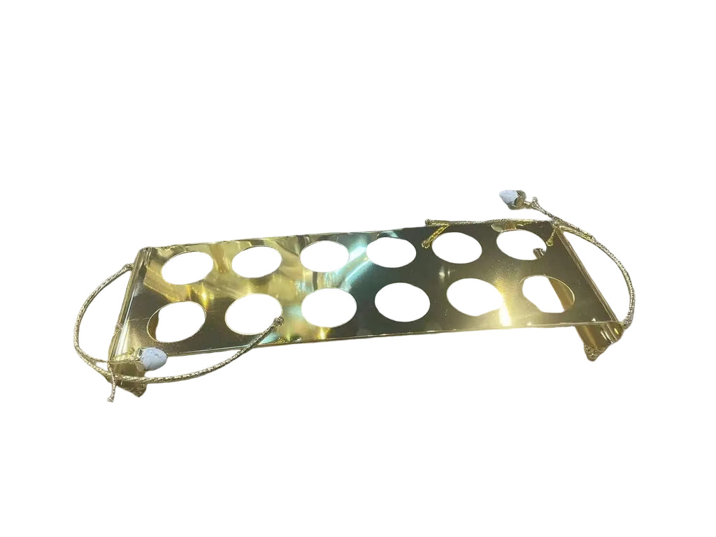 Anchoring the set is a sculptural stand, finished in either gold or silver, offering both visual impact and versatility. Measuring 52cm in length and 6.6cm in height, the stand is thoughtfully proportioned to accommodate the included glasses, while also fitting other cups or small bowls of approximately 5.5cm in diameter—ideal for curated tablescapes and elegant entertaining.